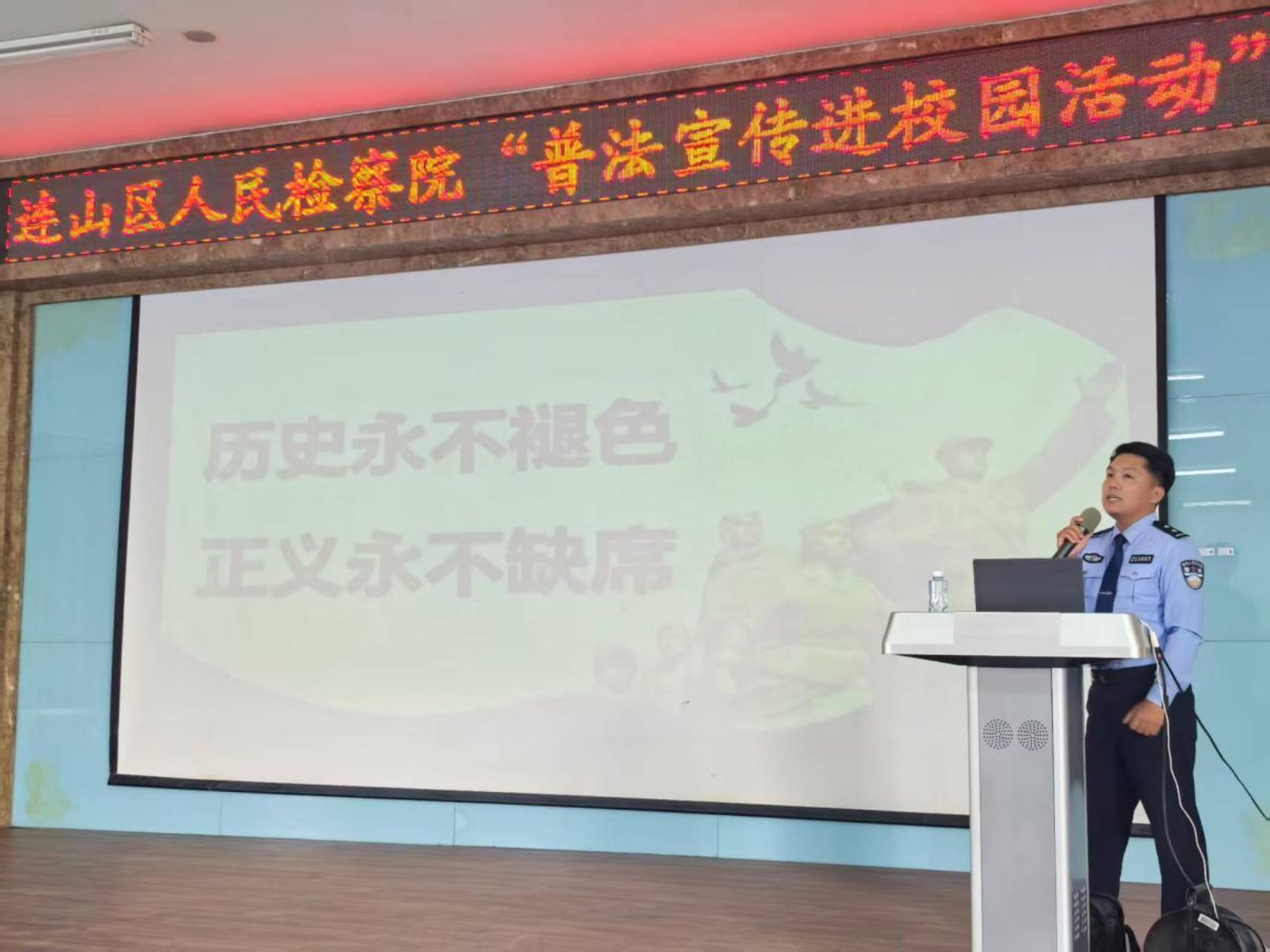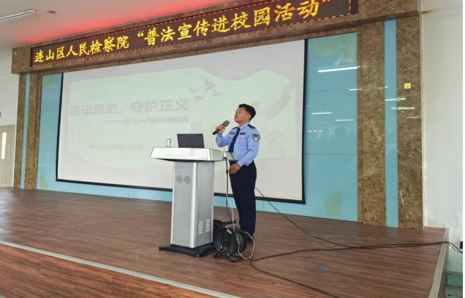 2025年9月16日,在九一八事变94周年来临之际,连山区人民检察院司法警察大队与“心连心”未检工作室携手,由法警大队李正希在连山实验中学为学生们带来了一堂别开生面的爱国主义法治教育课。此次课程邀请区人大法制工作委主任周力夫、监察司法委主任冯秀双、区政法委副书记陈永宝、区教育局副局长付友、区关工委主任张明威等领导以及我院党组副书记、分管日常工作的副检察长赵大维出席。
